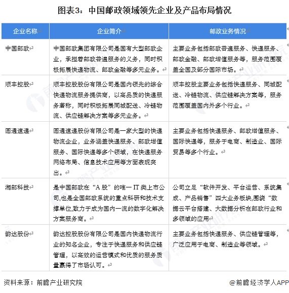 中国邮政行业参与企业有顺丰控股、中国邮政、湘邮科技、圆通速递等,这些企业在邮政、仓储邮政、冷链邮政等领域具有较强竞争力。随着国内电商行业的持续繁荣以及消费者对寄递服务质量要求的不断提高,邮政市场持续扩展。