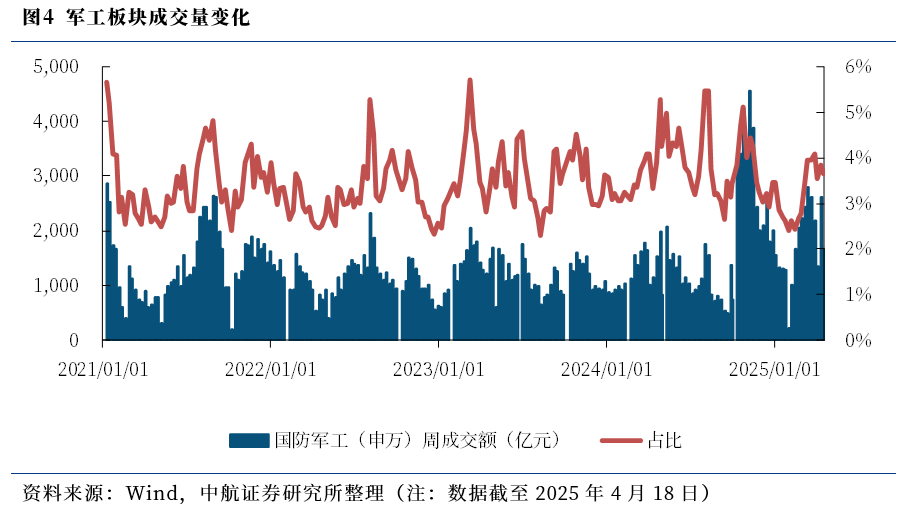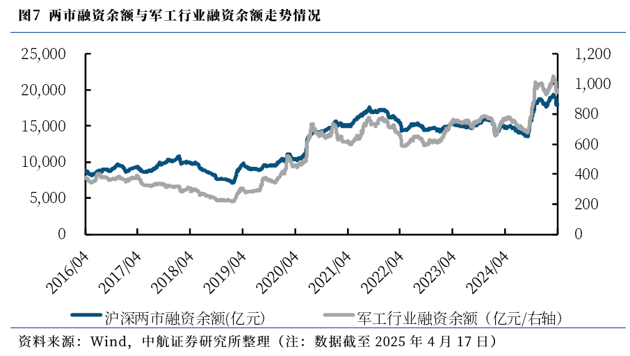 截至2025年4月17日,军工行业的融资余额合计958.03亿元,比上周环比增长0.77%,占两市融资余额比例为5.34%。