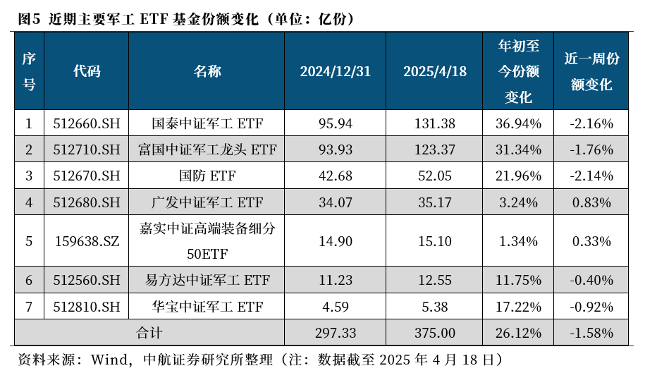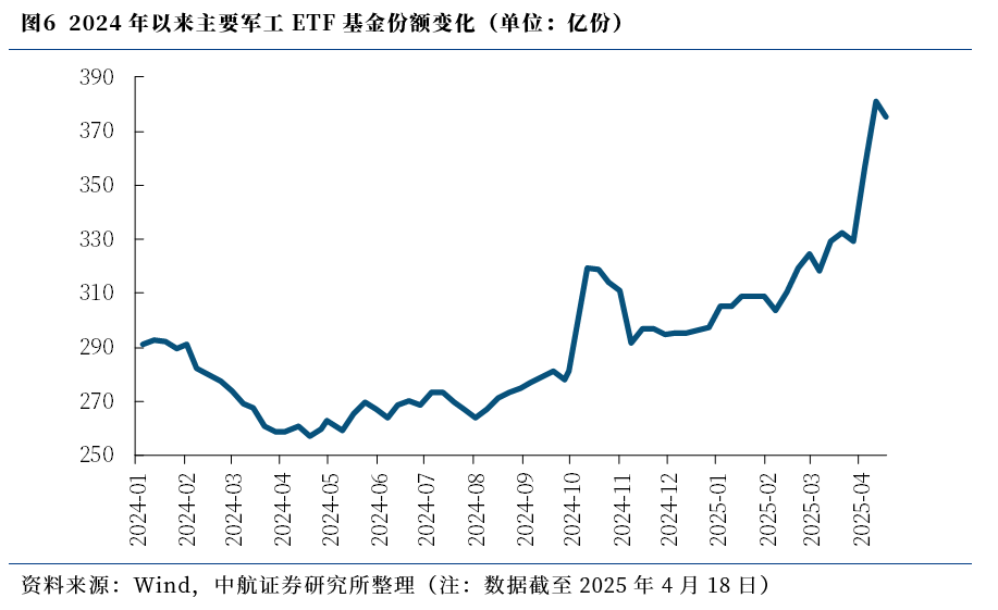 从交易层面来看,3月底以来14个交易日内(截至4月18日),主要军工ETF基金份额增加12.25%(4月7日当天增加2.22%),年初至今已增长26.12%,充分体现出市场环境波动下,市场对于军工板块发展依旧充满信心;