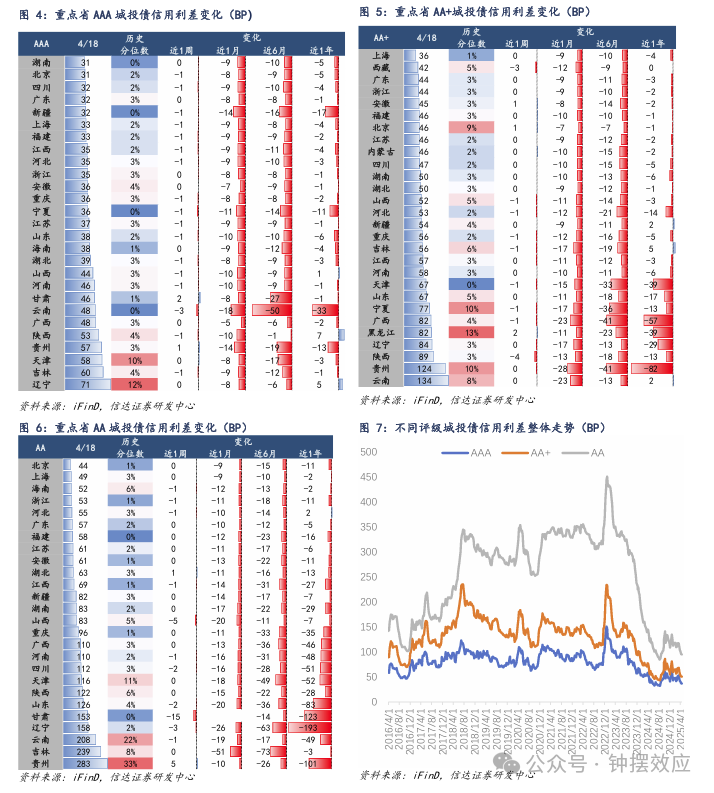 分行政级别来看,省级平台信用利差下行1BP,地市级和区县级利差较上周持平。各省级平台利差多数下行0-1BP,云南下行3BP;多数区域地市级平台利差下行0-2BP,甘肃下行15BP;多数区域区县级平台利差持平或上行1BP,河北和辽宁下行3BP,陕西下行4BP,贵州上行8BP。