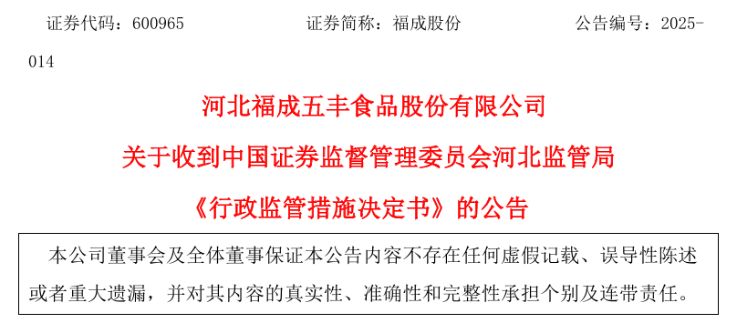 4月19日,河北福成五丰食品股份有限公司(福成股份,600965)披露关于收到中国证券监督管理委员会河北监管局《行政监管措施决定书》的公告。
