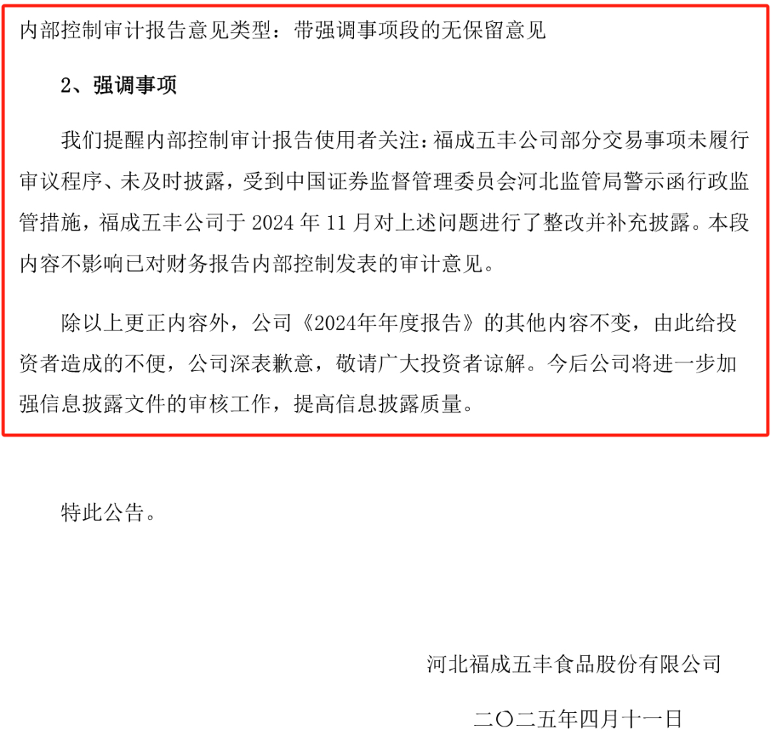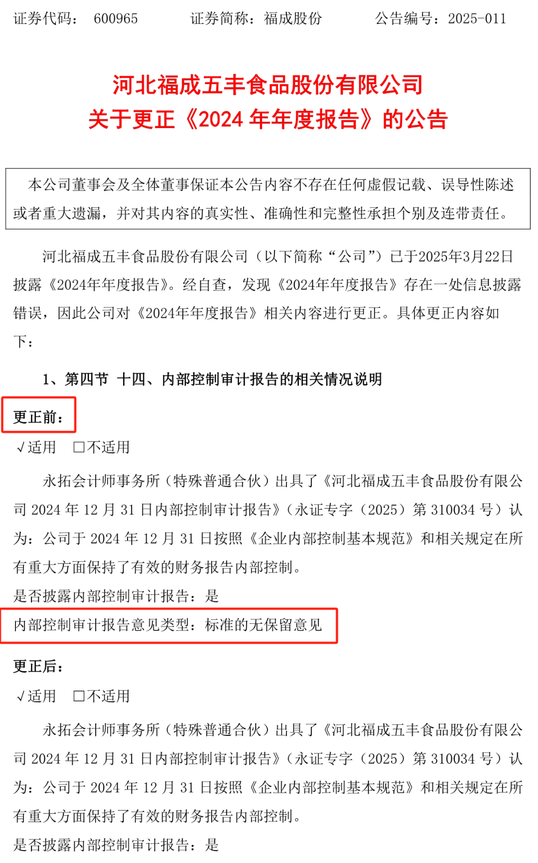河北证监局在对福成股份2024年年报监管中,发现以下问题:公司于2025年3月22日披露的《2024年年度报告》第四节“内部控制审计报告的相关情况说明”中披露内部控制审计报告意见类型为“标准的无保留意见”,与公司同日公告的《内部控制审计报告》披露的“带强调事项段的无保留意见”类型不一致。4月11日,公司披露了更正《2024年年度报告》的公告,将内部控制审计报告意见类型更正为“带强调事项段的无保留意见”。