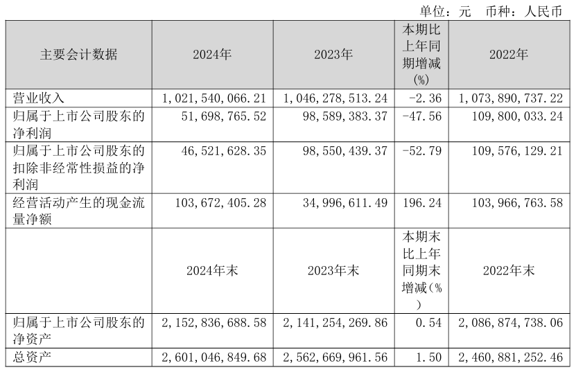2024年公司实现营业收入10.22亿元,同比减少2.36%;归母扣非净利润4652.16万元,同比减少52.79%。