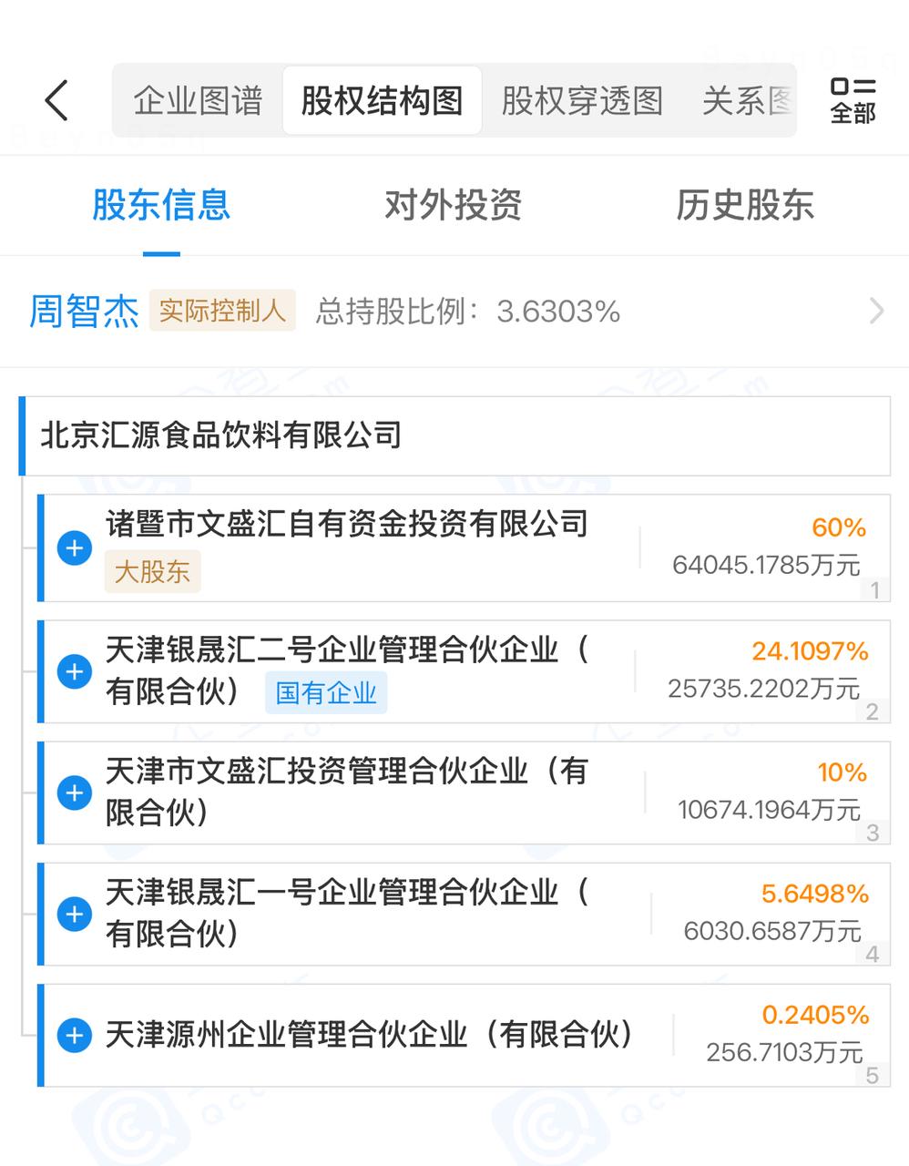 根据企查查数据,目前,北京汇源的最大股东为诸暨市文盛汇自有资金投资有限公司,持股比例为60%。