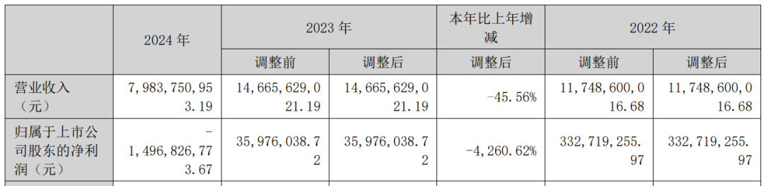 报告期内,南都电源营业收入79.84亿元,同比下降45.56%(调整后)。归属于上市公司股东的净利润-14.96亿元,同比下降4,260.62%(调整后)。