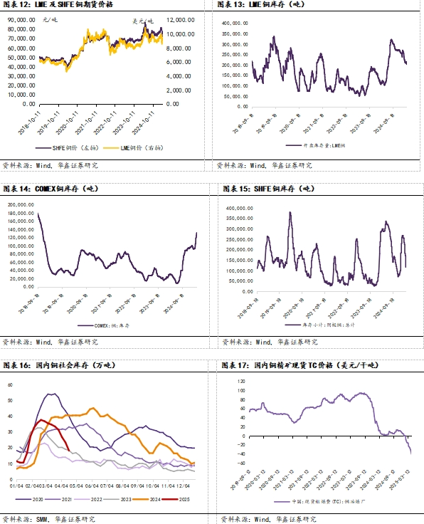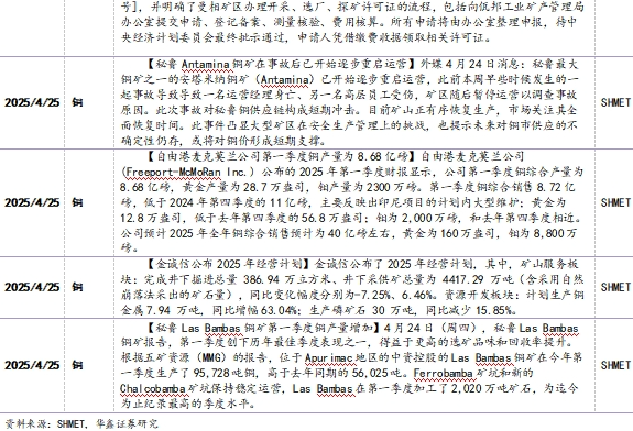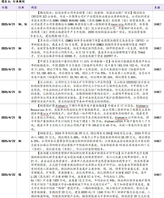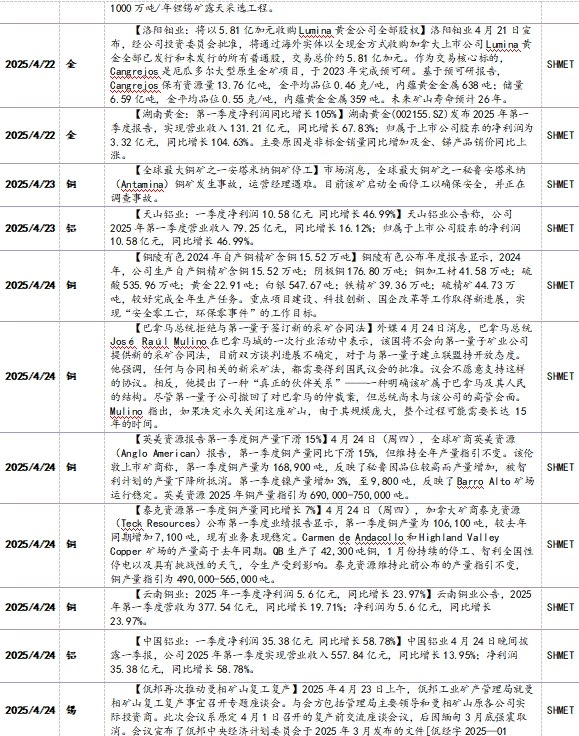 铜:价格方面,本周LME铜收盘价9415美元/吨,环比4月17日+283美元/吨,涨幅3.10%。SHFE铜收盘价77650元/吨,环比4月17日+1780元/吨,涨幅2.34%。库存方面,LME库存为203425吨(环比4月17日-9975吨,同比+82825吨);COMEX库存为131519吨(环比4月17日+8392吨,同比+104969吨);SHFE库存为116753吨(环比4月18日-54858吨)。2025年4月24日,SMM统计国内电解铜社会库存18.17万吨,环比4月17日-5.17万吨,同比-22.18万吨。