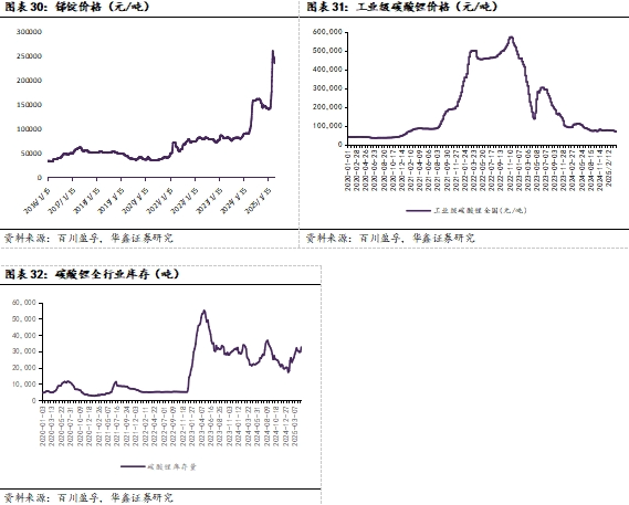 锂:根据百川盈孚数据,价格方面,本周国内工业级碳酸锂价格为6.75万元/吨,环比4月18日-1000元/吨,跌幅为1.46%。库存方面,本周国内碳酸锂全行业库存32560吨,环比+2860吨。
