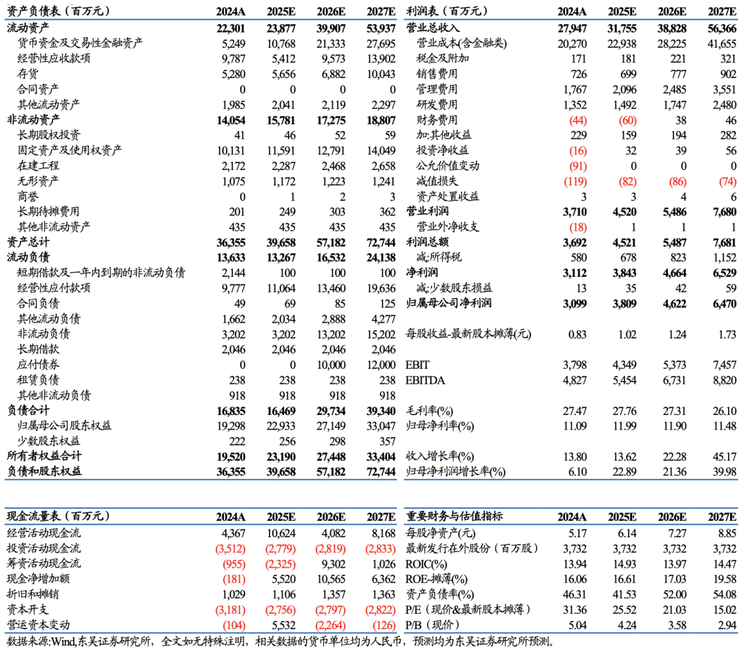 人形元年已至、公司进展顺利、未来利润弹性显著。海外龙头明确底数千台产量,29或者30年超100万台。公司聚焦机电执行器,配合客户全系列研发送样,同时持续加大全球生产布局,先发优势明显并获得客户认可,预计公司获得主供地位确定性强。按照100万台出货测算,执行器总成5万元,净利率10%,可贡献35亿元利润,弹性显著。