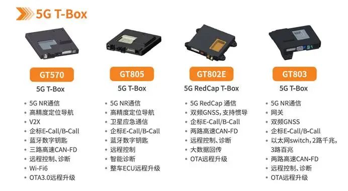 5G T-Box 系列中的GT805、GT802E,支持5G NR通信与高精度定位导航,并集成V2X等功能,基于不同平台模组与AutoSAR架构,实现通信、计算、安全的融合,为智能驾驶提供有力支撑。