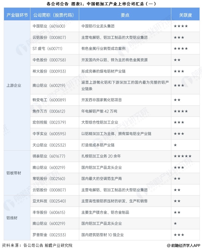 行业主要上市公司:天山铝业(002532)、明泰铝业(601677)、中国铝业(601600)、南山铝业(600219)、云铝股份(000807)、新疆众和(600888)、神火股份(000933)、宏创控股(002379)、东阳光(600673)等