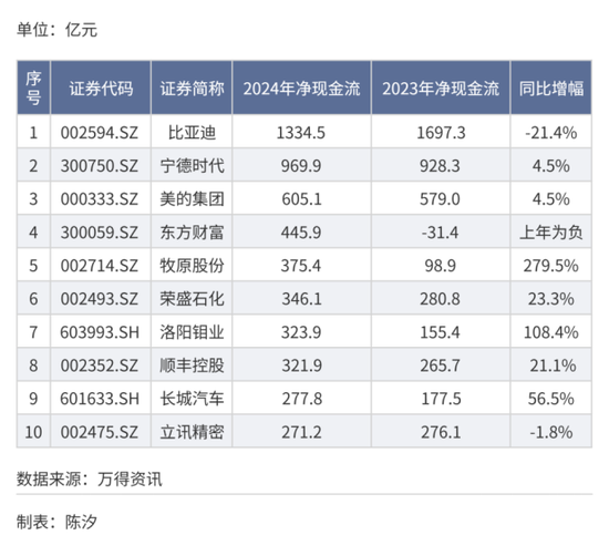 表4列出了2024年A股“经营性净现金流”最高的十家民企。A股民企中,只有比亚迪的数值超过了1000亿元,宁德时代为970亿元,位居第二。立讯精密以271亿元排在第十。