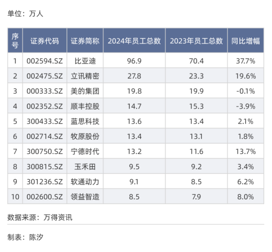 表9列出了排序结果。2024年底比亚迪拥有96.9万员工。比亚迪员工总数比2023年增长了37.7%,反映了其业务的快速扩张。
