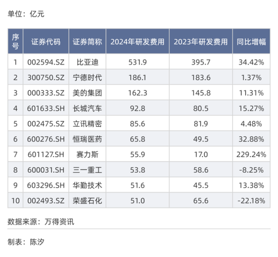 从研发费用同比增速看,赛力斯以229%排在第一,比亚迪以34.4%排第二,恒瑞医药以32.9%排第三。十家公司中,仅三一重工和荣盛石化研发费用略有下降。