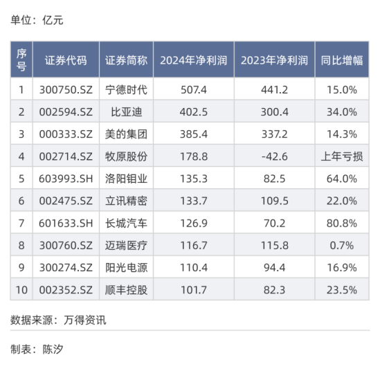 与净利润表(表2)对照,比亚迪、宁德时代、美的集团仍居前三。第五名牧原股份在表2中是第四,第七名洛阳钼业在表2中是第五,第八名顺丰控股在表2中是第十,第九名长城汽车在表2中是第七,第十名立讯精密在表2中是第六。