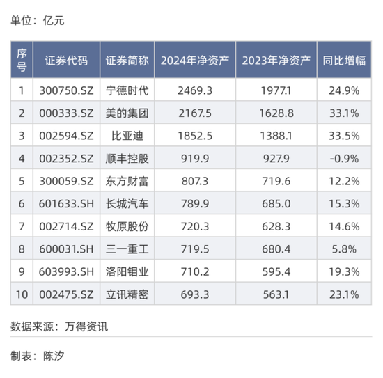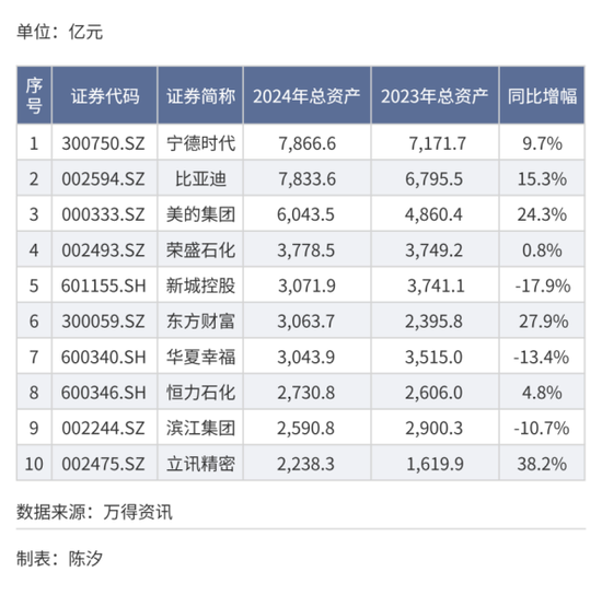 总资产十强中,前三名仍然是宁德时代、美的集团、比亚迪。
