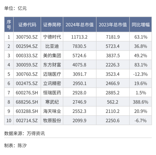 表1: 2024年A股总市值最高的十家民企(2024年12月31日收盘价)