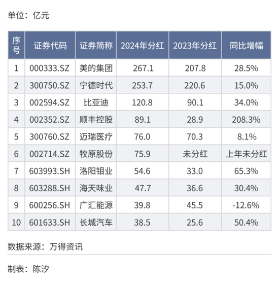表5列出了2024年A股民企分红十强。美的集团分红267亿元排在第一,宁德时代分红254亿元排第二,比亚迪分红121亿元排第三。长城汽车分红38.5亿元排第十。