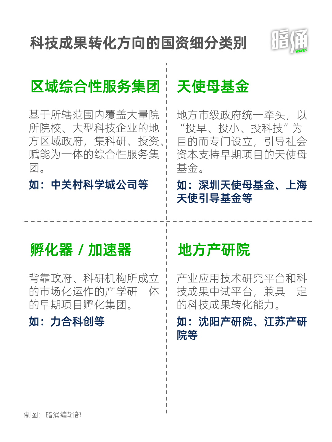 ‘暗涌Waves’大致统计和分类了专门聚焦“科技创新”、“科研成果转化”,投资种子、天使阶段科技企业的国资机构主体,大致可以分为以下四类:
