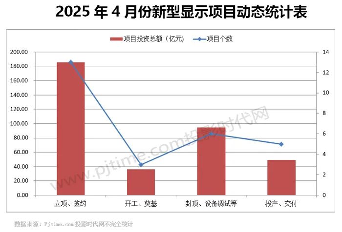 据Pjtime.com不完全统计,2025年4月签约/立项13个新项目,涉及投资额超185.26亿元。开工/奠基项目3个,涉及投资总额36.28 亿元;环评验收、募投获批、封顶、设备调试等建设中项目6个,涉及投资额超94.46 亿元;完工、投产、试产项目5个,涉及投资额超49.28 亿元。