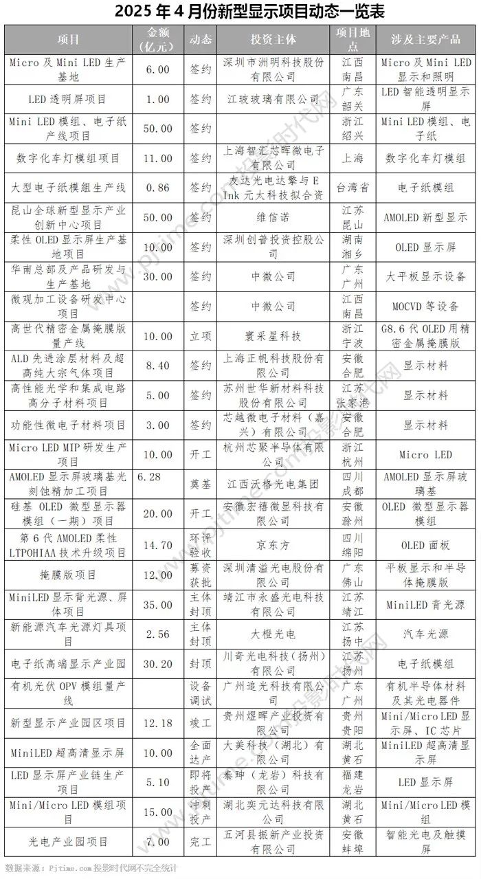 进入2025年4月份,LED、OLED、电子纸等新型显示项目投资依然火热。据Pjtime.com不完全统计,本月共有27个LED显示屏、MLED背光模组、AMOLED、Micro OLED硅基微显示、电子纸、平板显示、透明显示、触摸屏、车载显示、显示材料与制造装备等新型显示项目传来最新进展。涉及投资金额超过365亿人民币。