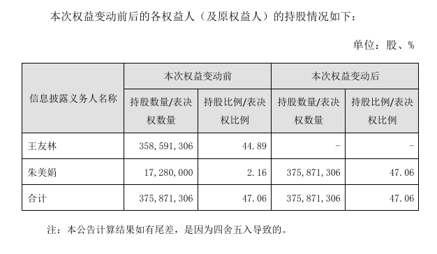 3、朱美娟女士继承王友林先生上述遗产后,其将持有公司股份375,871,306股,占公司总股本的47.05%。