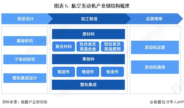 航空发动机产业链包括研发设计、加工制造(原材料、零部件、整机制造)、运营维修等环节。我国目前已基本建立了完整的航空发动机研制和生产体系。