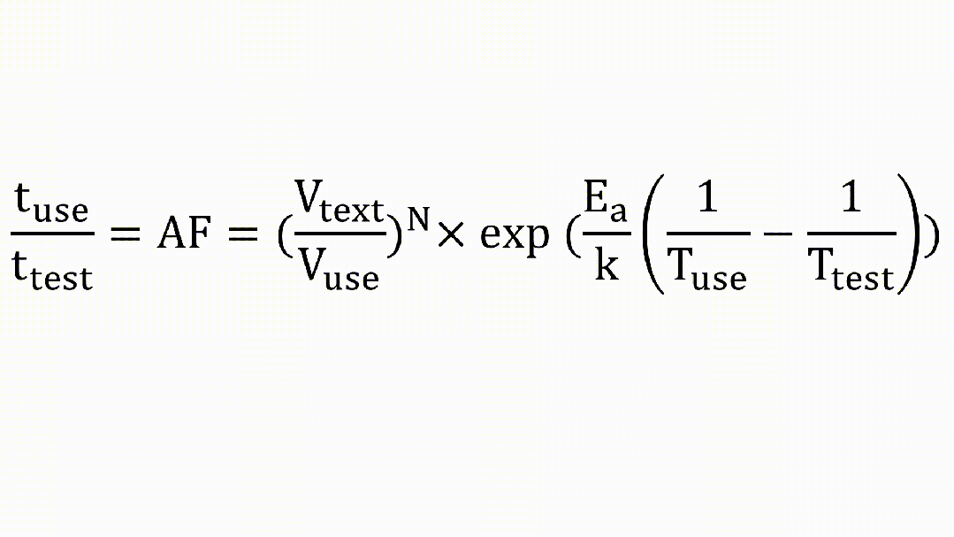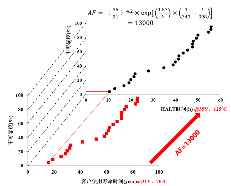 其中,AF 为综合应力加速倍数(客户使用寿命tuse比测试寿命ttest),N为电压加速系数,Ea为材料的激活能,两个常数反应的是材料的本征特性,通常由大量测试结果建立数学模型后求出。得到这两个参数后,只需要将试验所采用的试验电压、温度和客户所需的电压、温度Tuse代入右侧公式,将试验获得的结果代入左侧比值,则可求出客户使用条件下的产品寿命。