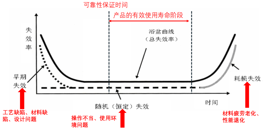 图2 产品的失效“浴盆曲线”,总共分为三个阶段,分别为:早期失效、随机失效和损耗失效