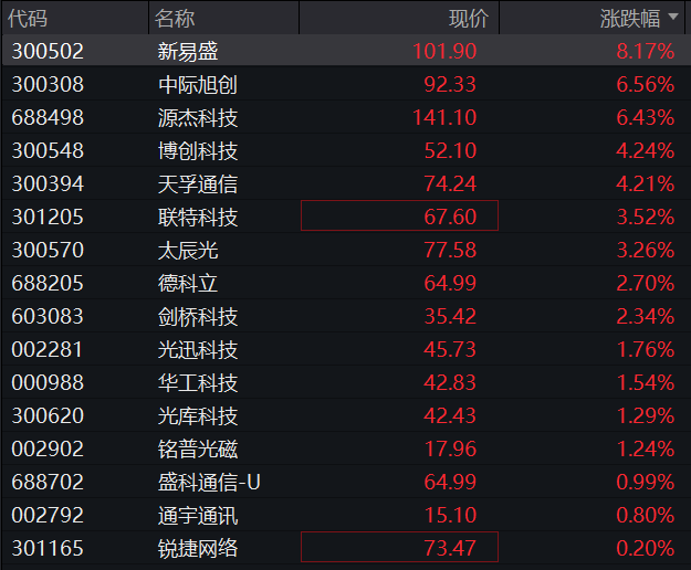CPO概念大幅走高,新易盛、中际旭创双双涨超5%,兆龙互连、天孚通信、长飞光纤、太辰光、源杰科技、博创科技等跟涨。