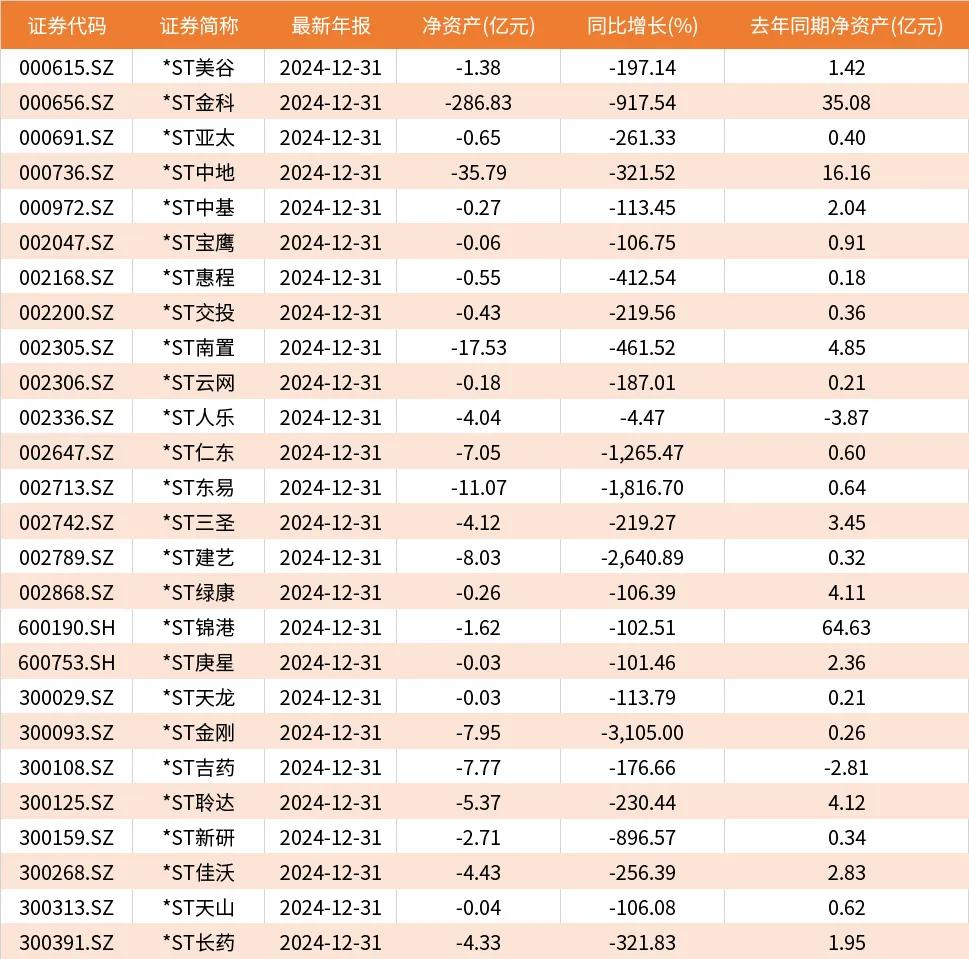 最近一个会计年度审计净资产为负值的有26家企业,比如*ST中地2024年净资产为-35.79亿元,而上一年则为16.16亿元,严重缩水。