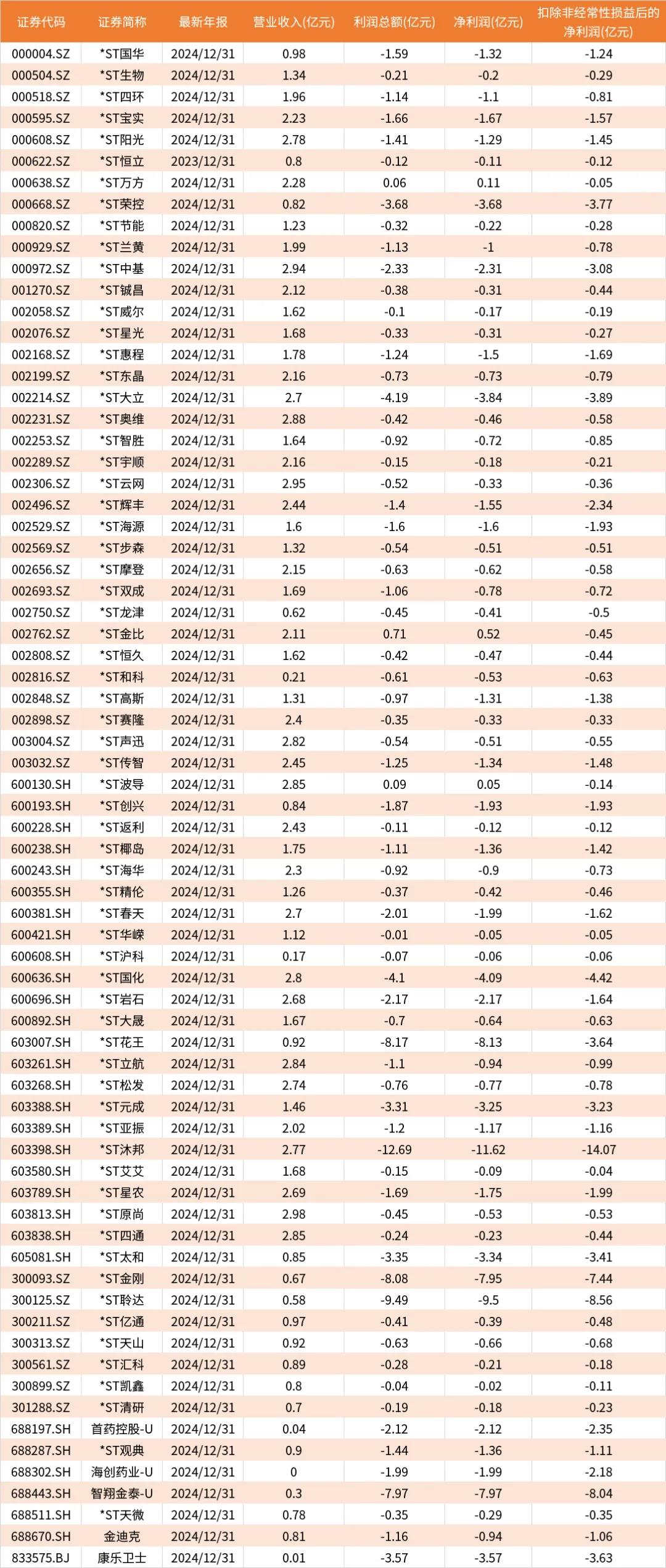 如*ST双成2024年度营收为1.69亿元,低于3亿元标准,且利润总额、净利润或者扣非净利润分别为-1.06亿元、-0.78亿元和-0.72亿元,均为负值。
