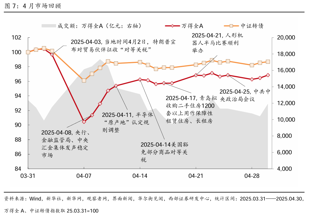 4月权益市场走出超跌反弹行情,万得全A指数当月仍收跌3.2%。整月市场围绕“关税”、“政策预期”和“科技成长”3个方向展开交易。月初关税冲击下,万得全A指数4月7日单日下跌9.3%;随着次日开始“国家队”坚定增持权益市场,A股迎来一轮超跌反弹的行情,反关税的农牧板块表现出显著超额收益。进入4月中旬,随着反弹行情的结束,市场开始定价关税对上市公司盈利水平的负面影响,市场量能一度萎缩至万亿元以下;防守方向的银行,博弈月末政策预期的地产链阶段性有所表现;定价长久期收益的科技成长板块月末最后两周获得市场青睐。权益市场巨震下,4月末转债市场平价中位数下跌4.4元,绝对价格中位数下跌1.0元至119.3元;4月下旬科技风格再度占优格局下,转债估值表现出较强韧性,月末转债市场百元平价溢价率25.2%,较3月末上升2.4pp;中证转债指数月度收跌1.3%,相较权益市场表现出一定的抗跌性。