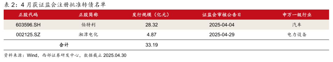 待发转债:截至4月30日,4月2支待发转债获得证监会注册批准,待发规模为33.19亿元。