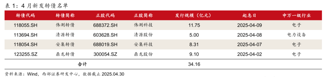 新发转债: 25年4月转债供给环比下降,同比24年有所回升;截至4月30日单月新发4支转债,合计规模34.16亿元。