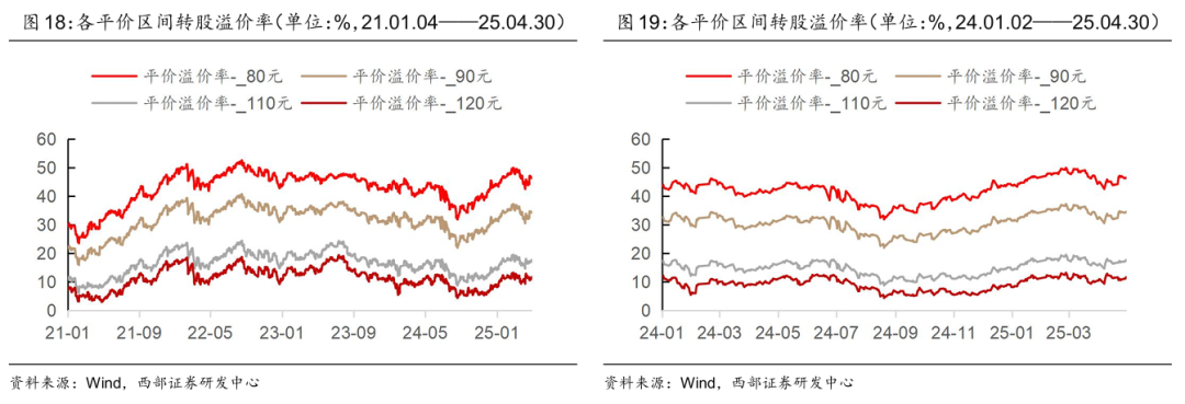 4月转债估值表现出较强韧性,月末市场百元平价溢价率25.2%,较3月末上升2.41pp,处于2018年、2021年以来77.9%和62.5%分位数水平。不同平价40 /60 /80 /90 /110 /120 /130 元对应转股溢价率分别为160.0%、83.7%、46.6%、34.6%、17.7%、11.7%和6.8%,较3月末分别变动-10.3pp、-0.7pp、+2.2pp、+2.6pp、+2.0pp、+1.3pp和+0.4pp,处于2018年以来72.3%、81.4%、81.4%、79.8%、75.7%、72.1%和66.1%分位数水平,2021年以来53.0%、68.5%、68.4%、65.7%、58.7%、52.6%和43.5%分位数水平。