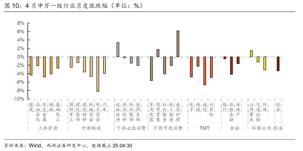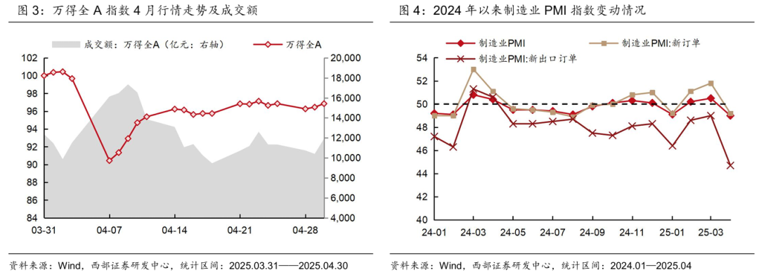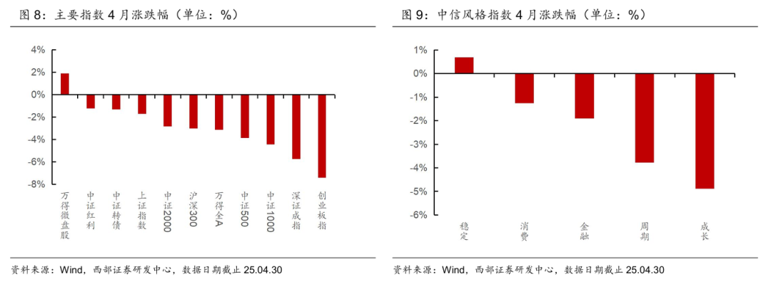 4月初权益市场遭遇关税冲击,整月市场呈超跌反弹之势,万得全A月度仍收跌3.2%。4月权益市场围绕“关税”、“政策预期”和“科技成长”3个方向展开交易;月初特朗普宣布对贸易伙伴征收“对等关税”,加征幅度超市场预期;全球股市巨震下,4月7日A股大幅回撤,万得全A指数单日下跌9.3%;随着次日开始“国家队”坚定增持权益市场,A股迎来超跌反弹行情,反关税方向的农牧板块周度涨幅居前。进入4月中旬,随着反弹行情的结束,市场开始定价关税对上市公司盈利水平的负面影响,市场量能一度萎缩至万亿元以下;防守方向的银行,博弈月末政策预期的地产链阶段性有所表现;定价长久期收益的科技成长板块月末最后两周获得市场青睐,但市场量能仍维持在万亿元附近,交易热情有限。从结构来看,4月小盘>大盘,价值>成长,沪深300、中证2000、万得微盘指数月度涨跌幅分别为-3.0%、-2.8%和+1.9%,上证、创业板指月度涨跌幅分别-1.7%和-7.4%。市场整体风格偏保守下,稳定风格月度取得正收益。