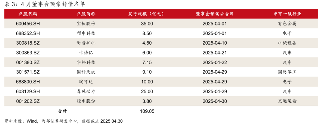 新增董事会预案:截至4月30日,4月9支公募转债董事会预案,待发规模为109.05亿元。