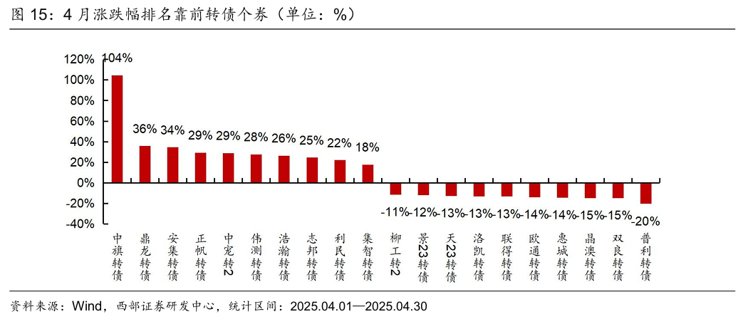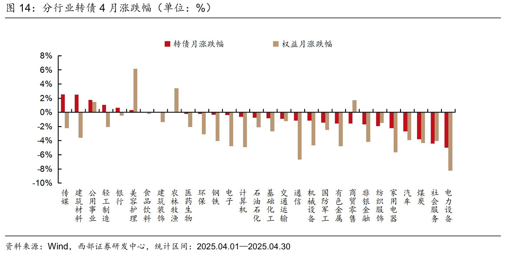 从行业表现来看, 29个存续转债的申万行业转债指数中仅6个行业指数上涨;结构上,受益于风语转债(提议下修)、中旗转债、太能转债(新券)个券表现拉动,传媒、建材、公用板块转债涨幅领先;个券方面,剔除新券后4月中旗转债(实控人拟变更)、中宠转2(关税受益+Q1业绩高增)、利民转债(涨价+Q1业绩超预期)领涨转债市场。