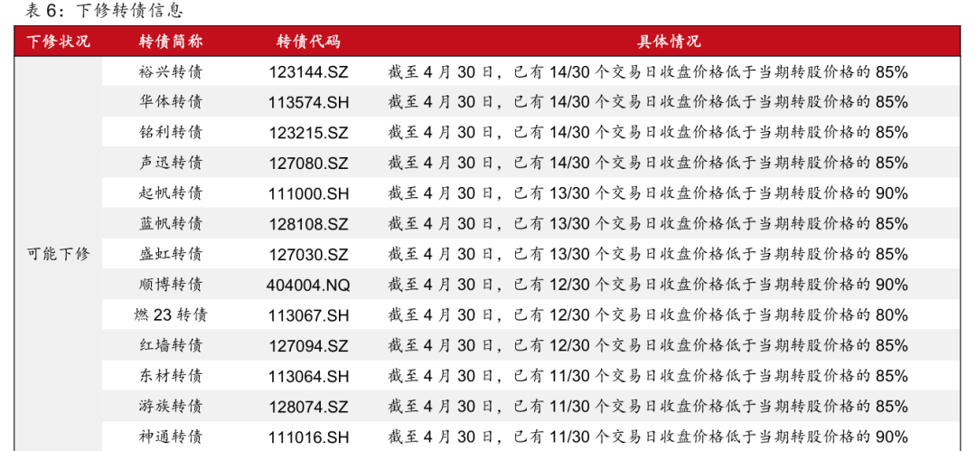 条款跟踪:截至4月30日,0支转债可能强赎,18支可能下修,4支提议下修;4月5支确认强赎,9支不强赎,4支确认下修,63支不下修。