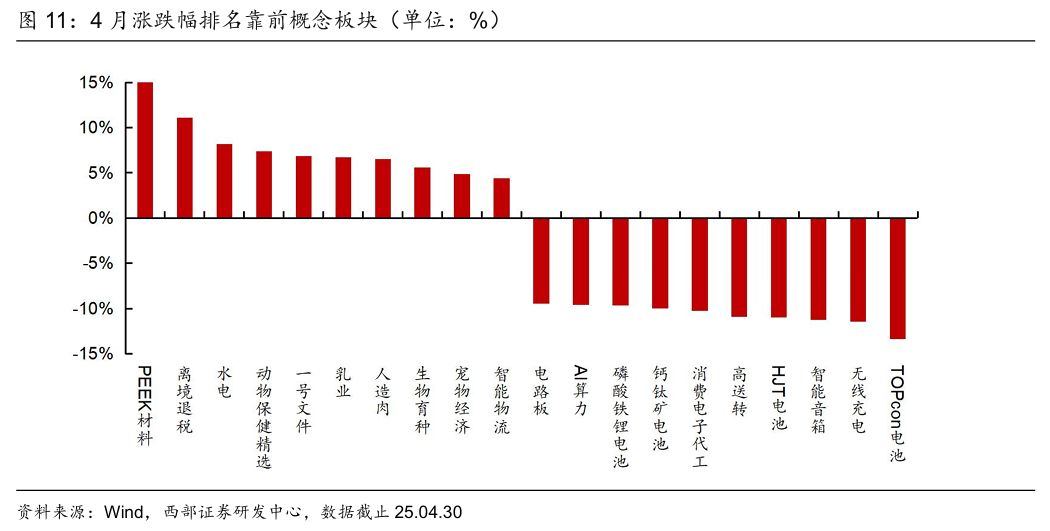 从行业表现来看,4月权益市场多数行业收跌,31个申万一级行业中,4个上涨,27个下跌。受益于反关税以及海外禽流感影响的农牧板块,“即买即退”政策利好的商贸零售板块,代表新消费的美护板块以及防守方向的公用事业板块涨幅居前。热门概念中,受人形机器人、低空经济双重利好的PEEK材料,政策利好的离境退税概念,水电概念月度涨幅居前。