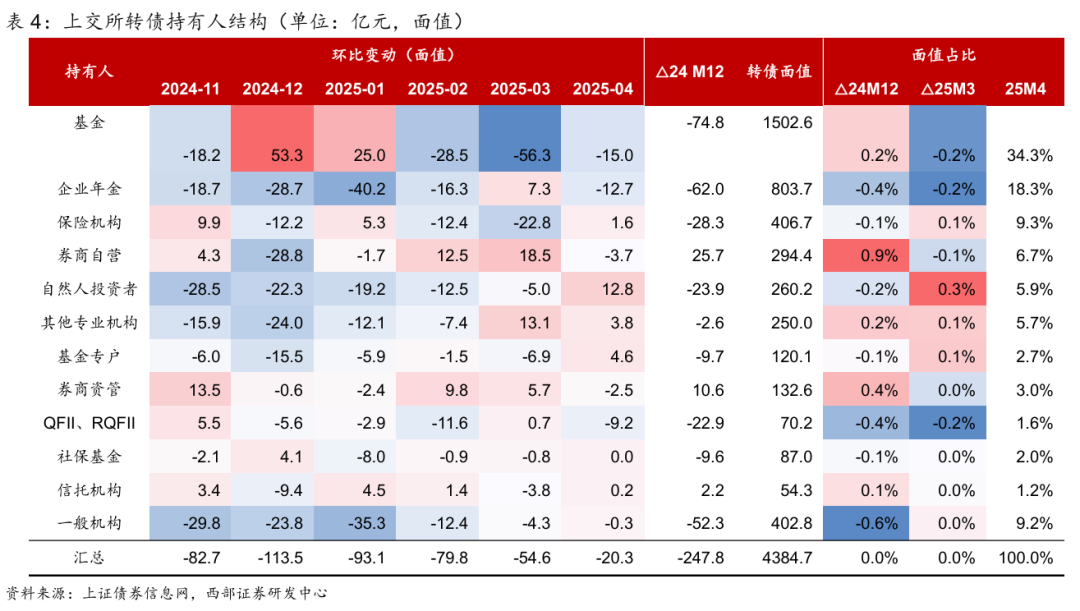 从上交所转债持有人结构看,4月主要机构投资者中基金、企业年金双双减仓沪市转债,保险持仓面值小幅增加。自然人、基金专户以及其他专业投资者加仓转债较为踊跃。