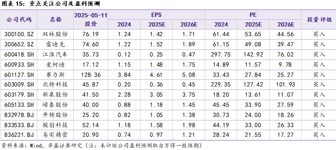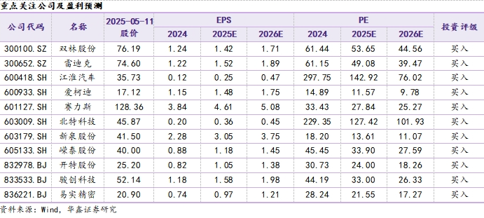 我们持续看好汽车行业,维持“推荐”评级:(1)整车:国内40万元以上市场进入壁垒较高,与华为有深度合作的鸿蒙智行车企有望逐步占据一定份额,建议关注赛力斯、江淮汽车、北汽蓝谷等;(2)汽车零部件:下游格局重塑、技术变迁叠加零部件出海,国产零部件迎来发展黄金期,关注成长性赛道:①内外饰:新泉股份、岱美股份、模塑科技(维权);②轻量化:关注文灿股份、爱柯迪、旭升集团、嵘泰股份;③智能化:城区NOA集中落地,Robotaxi加速推进,关注中国汽研、中汽股份、华阳集团、伯特利、保隆科技;④人形机器人:特斯拉Optimus量产在即,T链转型机器人的汽车零部件标的机会较大,建议关注三花智控、拓普集团、双林股份、五洲新春(维权)、北特科技、贝斯特;⑤北交所:建议关注骏创科技、开特股份、易实精密。