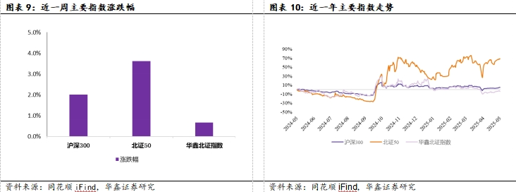本周北证50涨3.6%,华鑫北证指数涨0.7%。近一年以来(截至2025年5月9日),北证50、华鑫北证指数涨跌幅分别为69.0%、-3.2%,相对沪深300的收益率分别为+63.1pct、-9.2pct。
