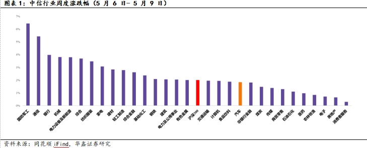 本周钢铁、铜、铝、橡胶价格均有下降。本周(5 月 6日- 5月9 日),我们重点跟踪的钢铁、铜、铝、橡胶、塑料均价分别为 0.36/7.85/1.97/1.15/0.72 万元/吨,本周周度环比分别为 -2.9%/+0.7%/-1.9%/+0.0%/-0.5%。5月 1 日- 5月9日价的月度环比分别为-9.3%/+2.2%/-2.4%/-12.2%/-1.0%。