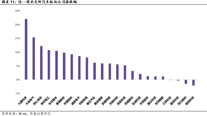 本周我们跟踪的23家北交所汽车板块公司涨跌幅均值为6.1%,中位数为5.9%。九菱科技(22.1%)、大地电气(15.4%)、同心传动(12.2%)等表现居前,骏创科技(-2.1%)、同力股份(-1.5%)、建邦科技(-0.3%)等表现靠后。