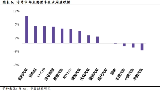 本周我们跟踪的14家海外整车厂涨跌幅均值为3.2%,中位数为3.8%。吉利汽车(10.1%)、特斯拉(6.4%)、LUCID(6.4%)等表现居前,丰田汽车(-2.6%)、小鹏汽车(-1.6%)、本田汽车(-1.1%)等表现靠后。