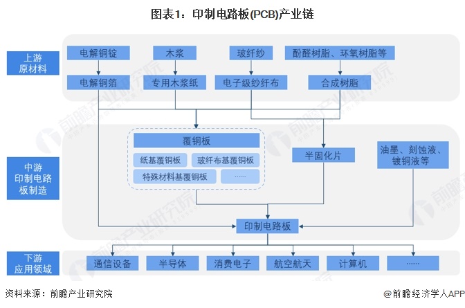 从产业链环节来看,印制电路板(PCB)上游主要为铜箔、铜箔基板、玻纤布、树脂等原材料行业;中游为印制电路板(PCB)制造环节,是指通过蚀刻等工艺将覆铜板制作成PCB板的过程;下游主要为印制电路板(PCB)应用领域,包括通信、光电、消费电子、汽车、航空航天、军用、工业精密仪表等领域。
