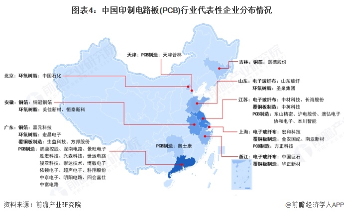 从印制电路板(PCB)行业代表性企业的区域分布来看,企业多分布于我国中东部地区。其中,广东、江苏、上海印制电路板(PCB)行业的代表性企业数量较多。