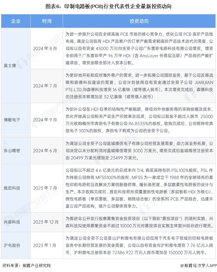 从投资动向来看,印制电路板(PCB)产业代表性企业的投资动向主要包括收购公司拓展业务、通过对子公司增资的方式投资印制电路板(PCB)项目等。印制电路板(PCB)产业代表性企业最新投资动向汇总如下: