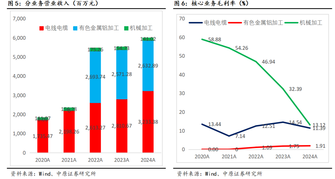 2024年分业务毛利率情况:电线电缆产品毛利率11.39%,同比下降3.05个百分点;铝板带产品毛利率1.91%,同比下降0.13个百分点。电线电缆业务中,特高压、超高压工程用线缆毛利率9.83%,同比下降3.95%;电力电缆毛利率14.6%,同比下降1.16%。